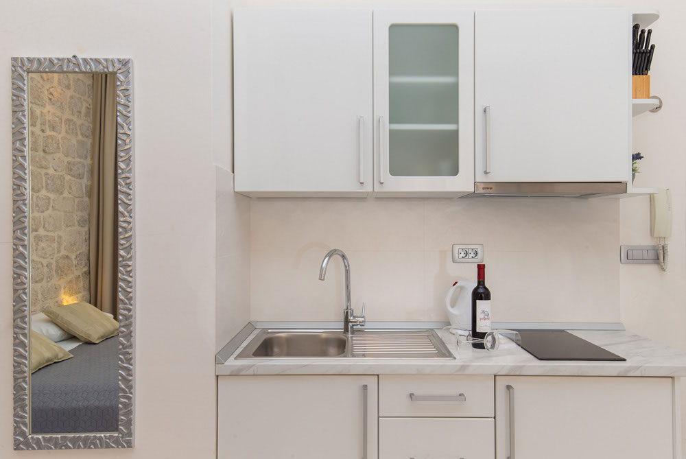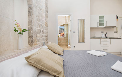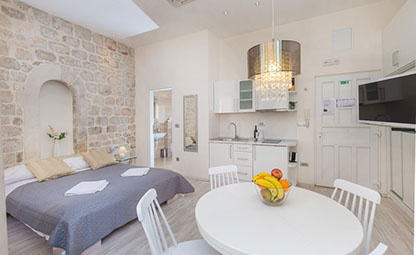 Studio apartment Lausion is luxury studio in the center of old town in authentic stone medieval house. It has all in one space: bedroom with king size bed, dinning table and small full equipped kitchen.